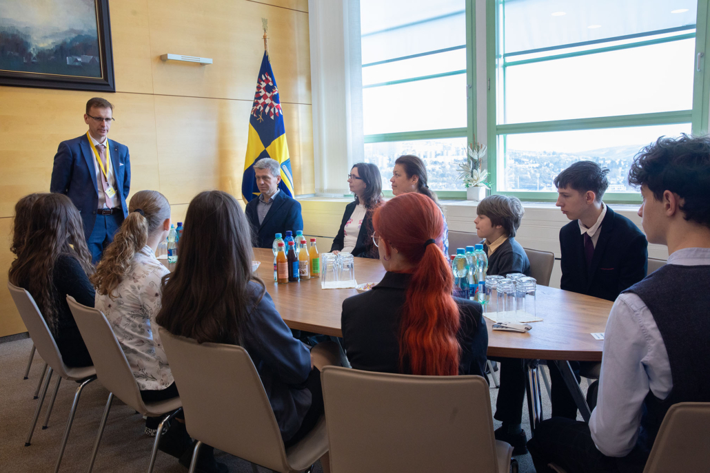 Za reprezentaci Zlínského kraje poděkoval našim filmařům ve čtvrtek 9. dubna také hejtman Radim Holiš. Ten ocenil zejména jejich citlivý přístup k těžkému tématu a snahu přemýšlet o historii i současném světě s velkou odpovědností. Návštěvy kanceláře pana hejtmana se účastnil kompletní tým, jenž se na snímku podílel, a odměnou mu byla nejen neformální diskuse se samotným panem hejtmanem, ale také prohlídka Baťova mrakodrapu, zejména pojízdné kanceláře Jana A. Bati. Snímek by však nevznikl bez spolupráce se žáky z partnerské školy „Anna Sophia“ z německého Kranichfeldu, s níž naše škola spolupracuje již 14 let.